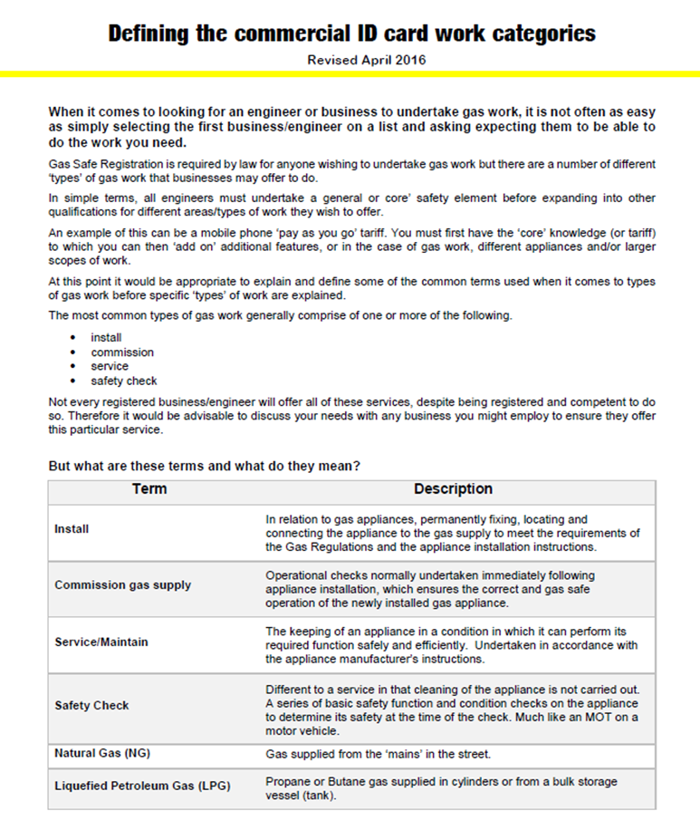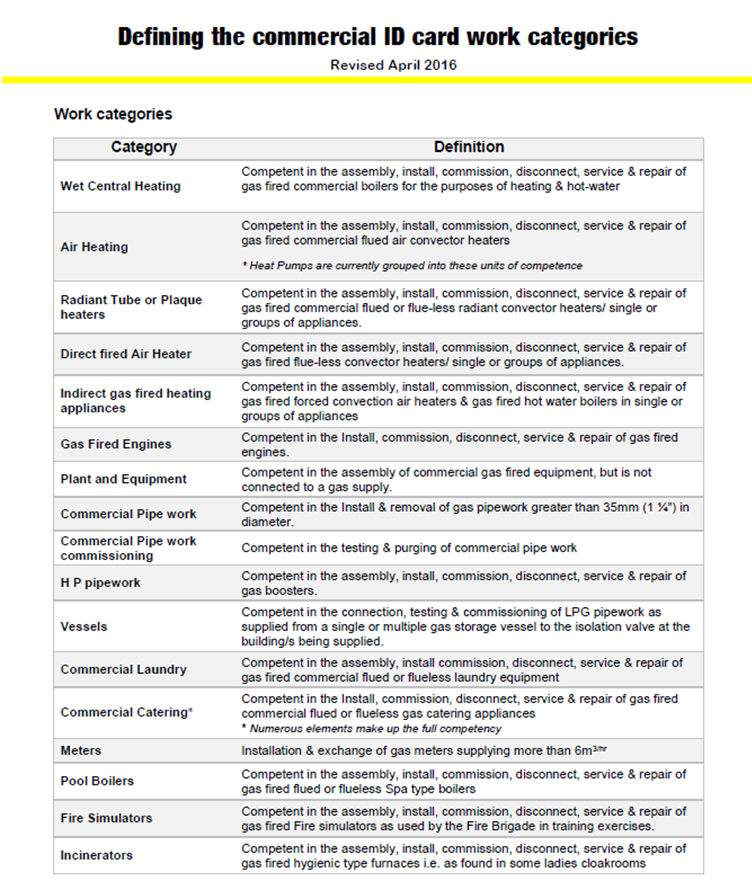 The core categories are listed on the Gas Safe cards which are issued to our technicians, full details can be checked on line. Check Gas Safe registered technicians.