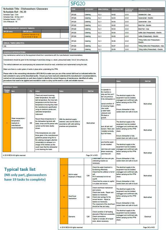 In 2014, a customer approached SFG20 to request schedules for commercial kitchen equipment. SFG20 in turn approached the Catering Equipment Suppliers Association (representing 190 manufacturers and agents for manufacturers in the UK) who produced and delivered the first catering schedules in January 2016. The standard is normally reviewed and updated annually.